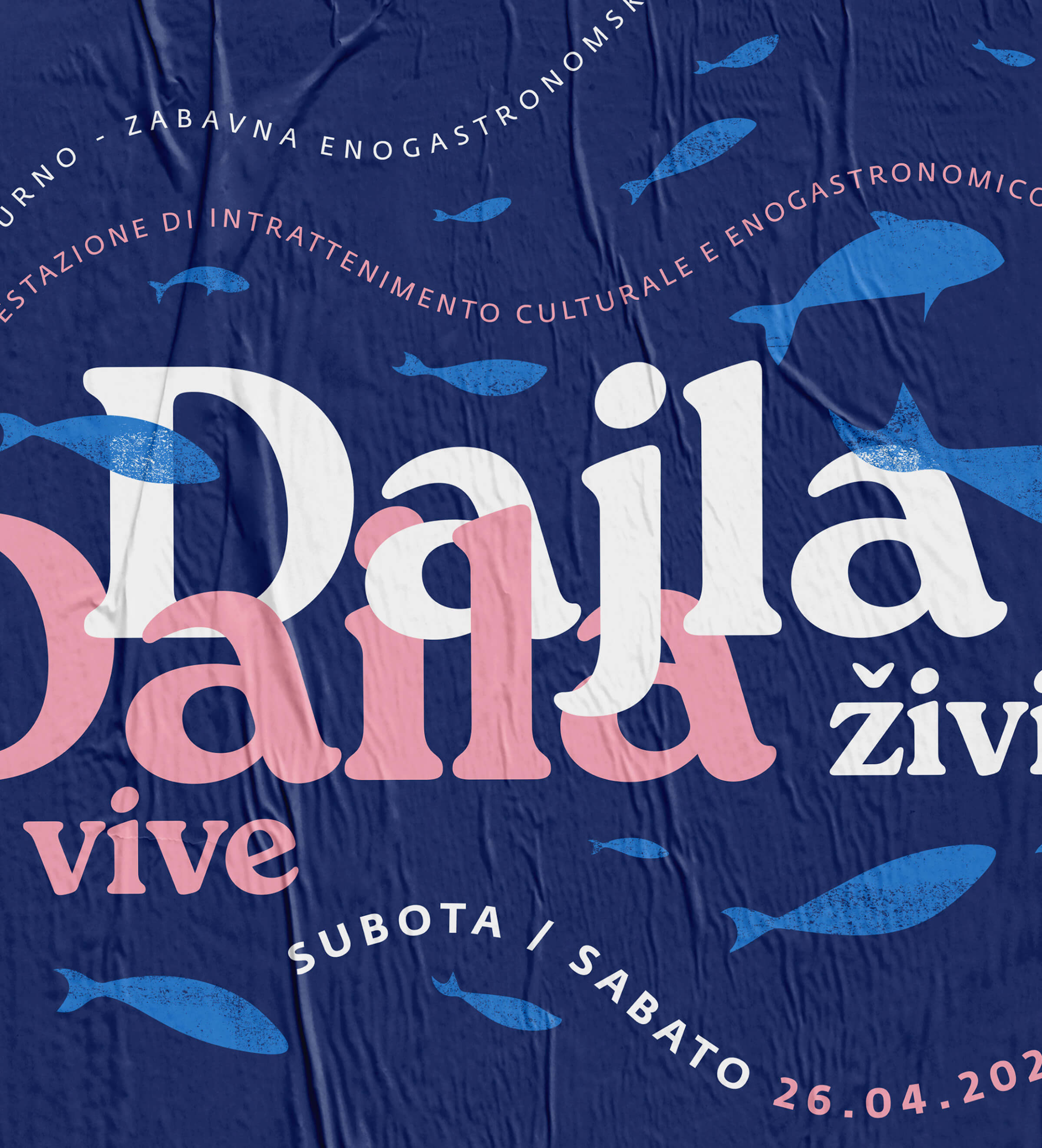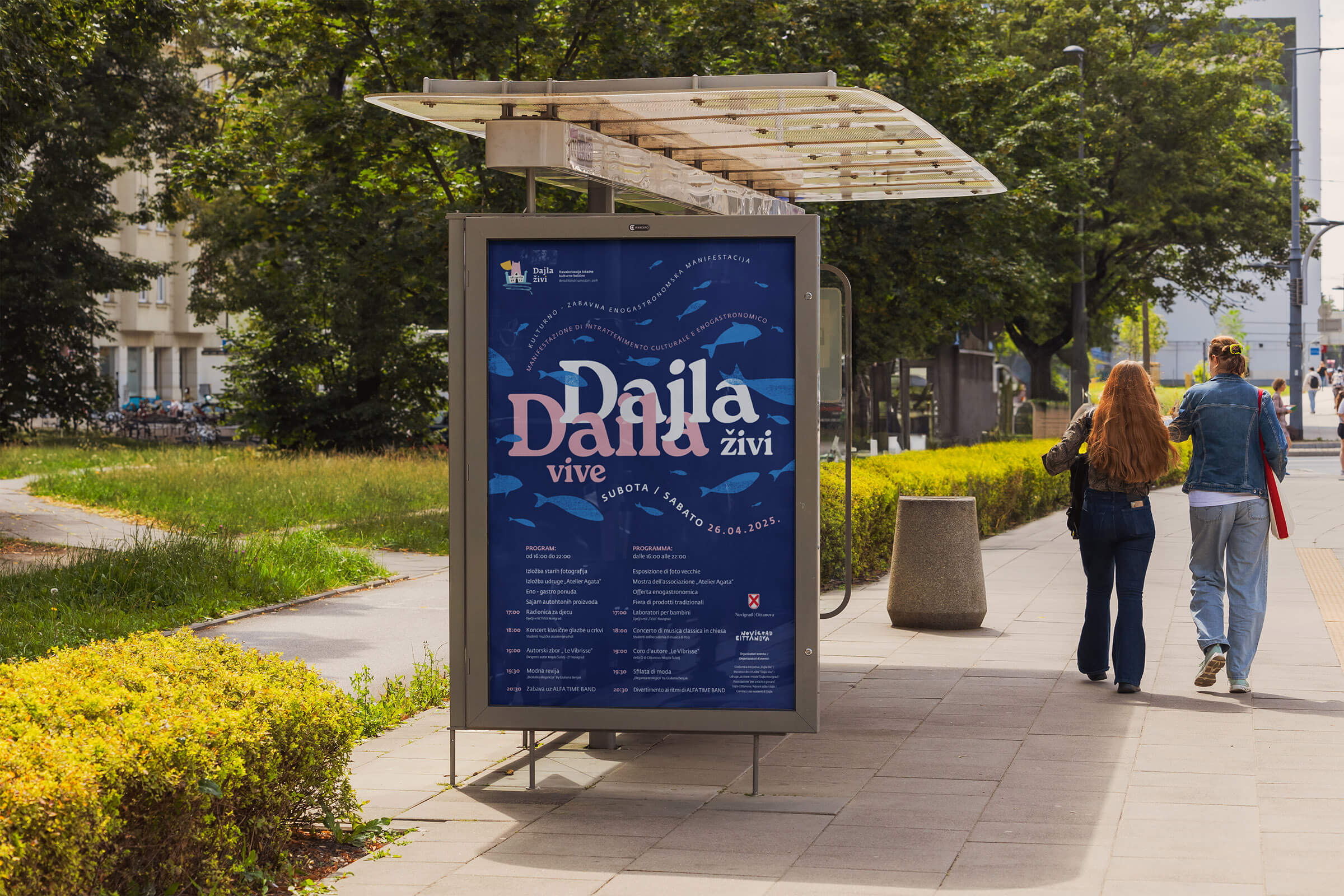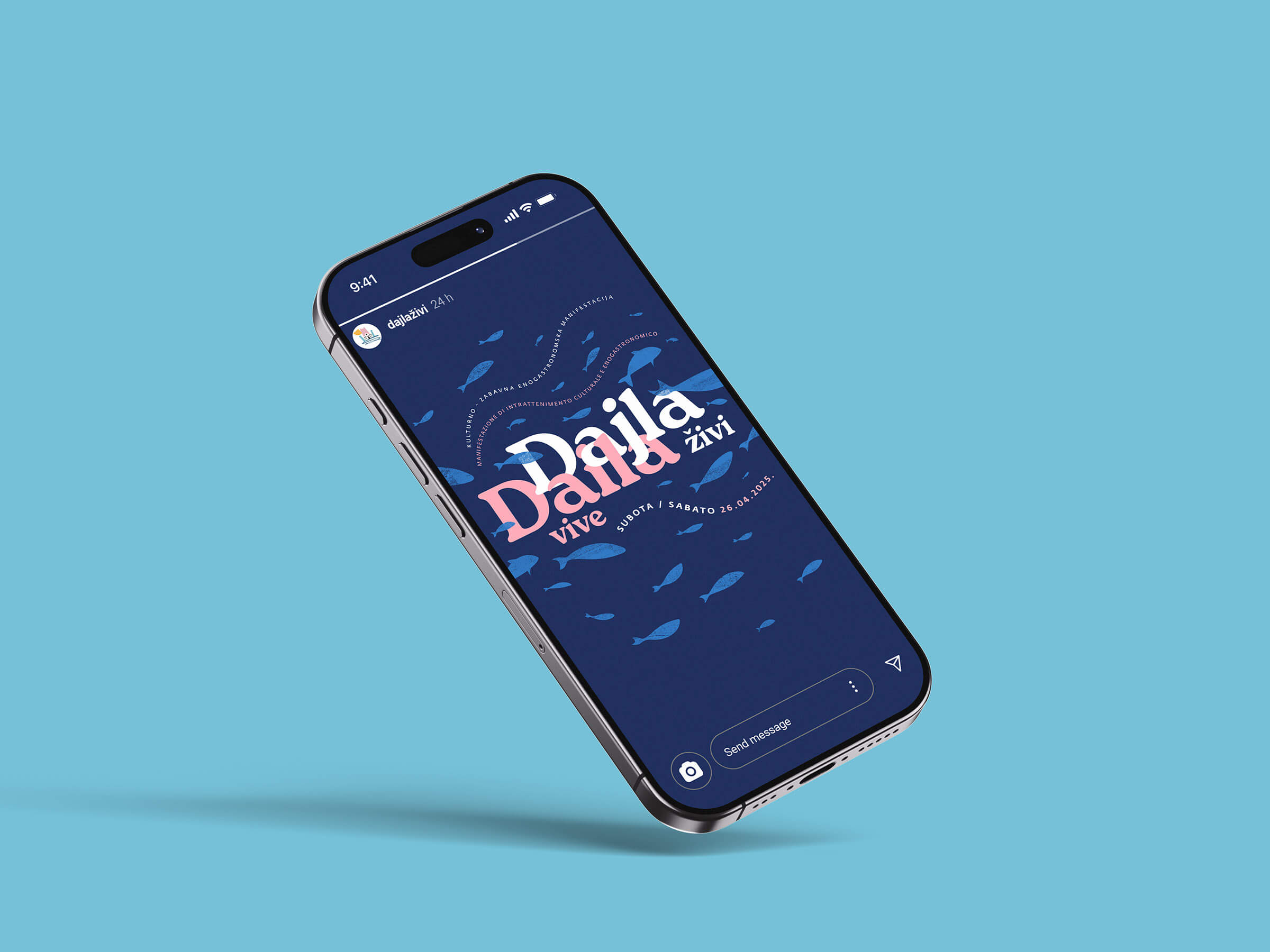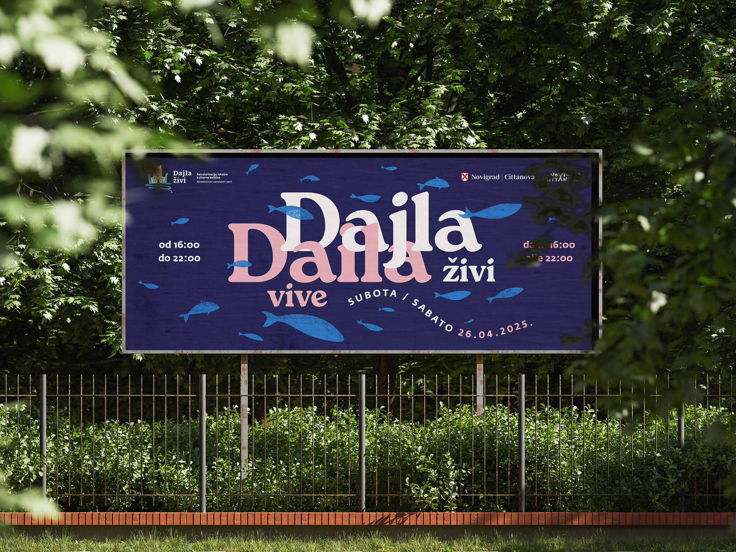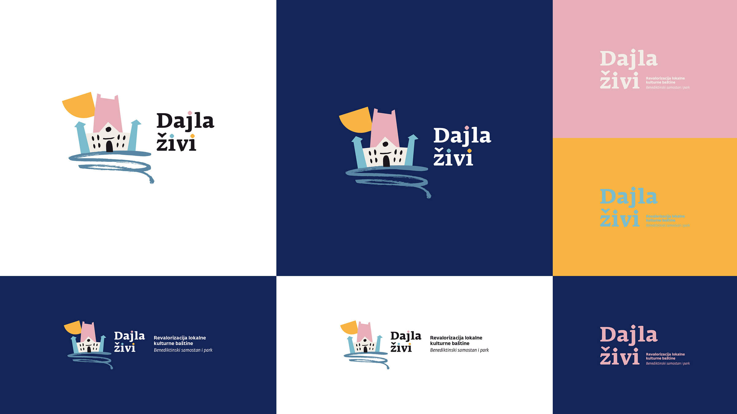 Za projekt smo dizajnirali logotip s ilustracijom samostanskog kompleksa, a kroz ostatak vizualnog identiteta provukli smo motiv jata riba – simboličan prikaz mora uz koje Dajla živi i diše.